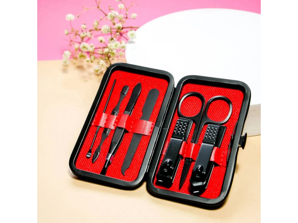 Elegantná manikúrna sada obsahuje 7 kozmetických doplnkov na manikúru, pedikúru a obočie v elegantnom čiernom puzdre s červeným lemovaním.