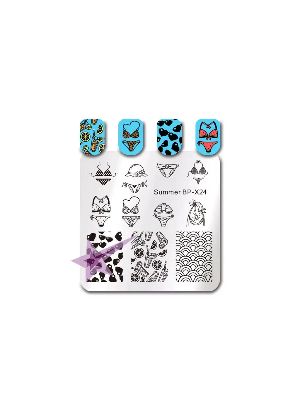 Hranatá kovová razítkovacia doštička edícia Born Pretty s motívmi leta - plavky, koktejly, palmy