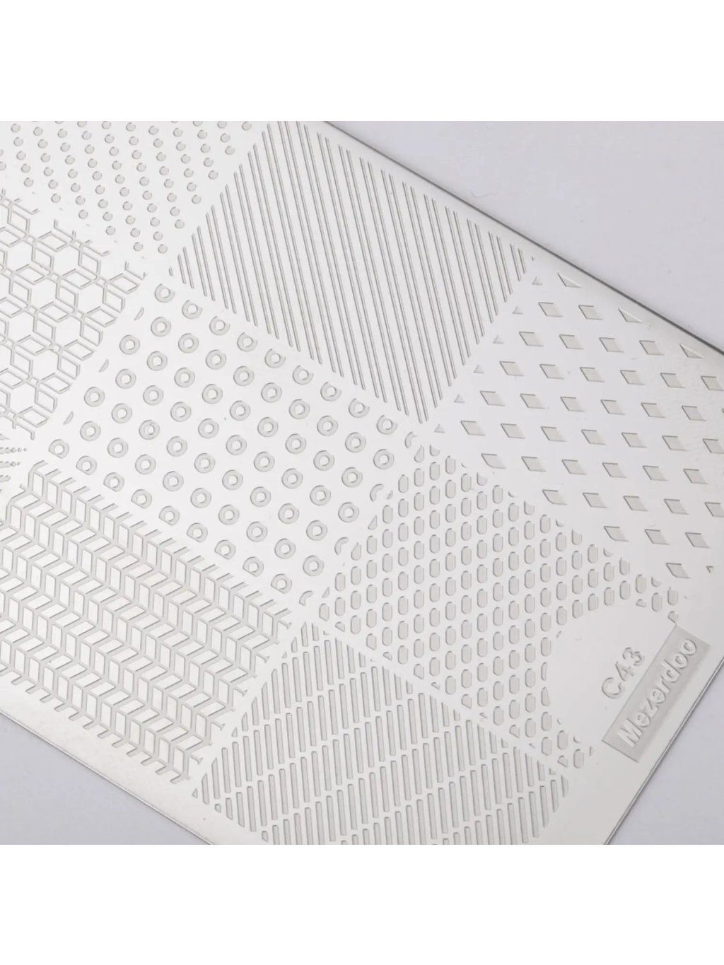 Precízne vzory pre dokonale jednotný look. Kovová razítkovacia doštička Mezerdoo C43 o rozmere 6 × 12 cm ponúka 12 rôznych motívov – dlaždice s pravidelnými drobnými vzormi, geometriu, pruhy, hviezdy, bodky i rôzne textúry. Ideálna pre celoplošné potlače i rýchle akcenty na krátke i dlhé nechty.