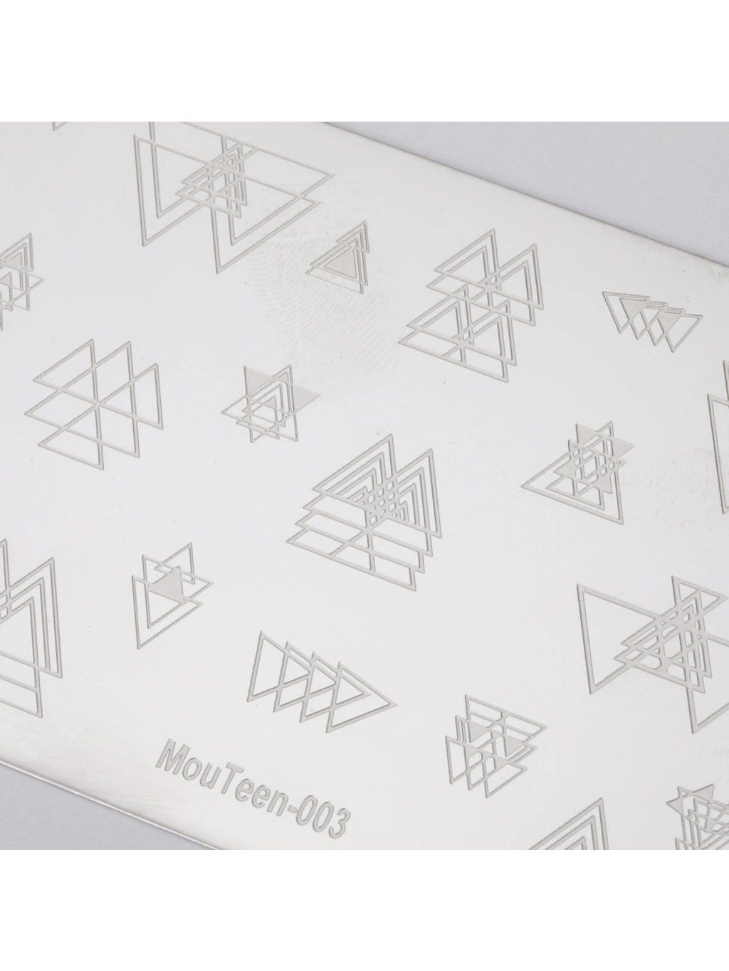 Moderná geometria na dosah. Kovová pečiatkovacia doštička Mouteen 003 o rozmere 6 × 12 cm ponúka viac ako 25 precízne vyrytých motívov inšpirovaných geometrickými tvarmi – trojuholníky, linky, vzory a minimalistické ornamenty. Ideálna pre elegantný, čistý a moderný nail art, ktorý nikdy nevyjde z módy.