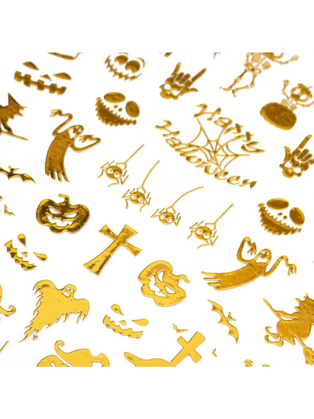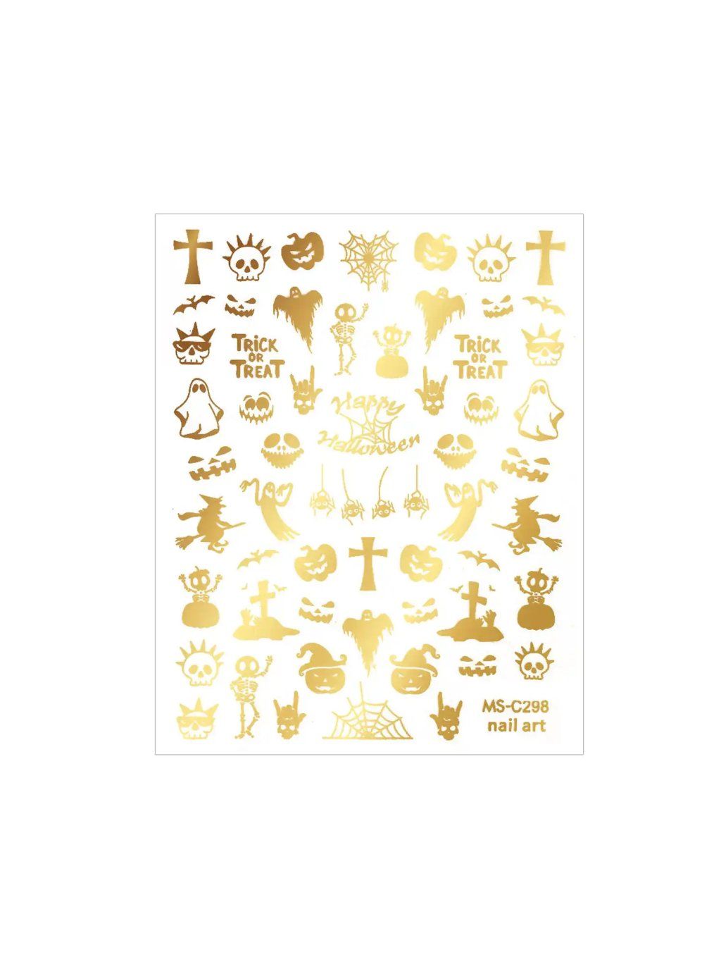Samolepky na nechty – Happy Halloween MS-C298 — 1 veľký hárok o veľkosti 8 × 13,5 cm so zlatými metalickými halloweenskymi motívmi.