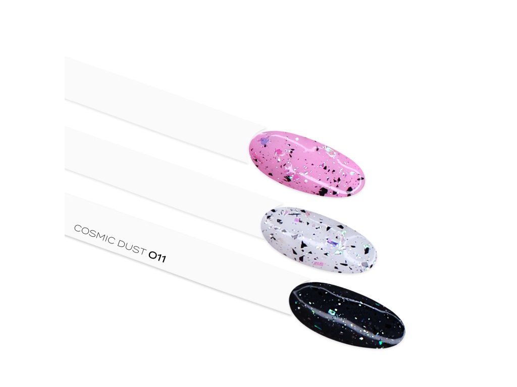 Fairy Effect Finish v odtieni 011 Cosmic Dust kombinuje ružový základ s mätovo-zlatým trblietom, zvýraznený striebornými odleskami a kontrastnou čiernou – pre unikátny kozmický efekt.