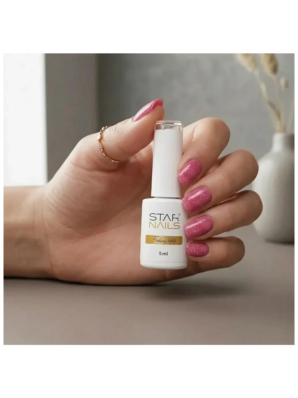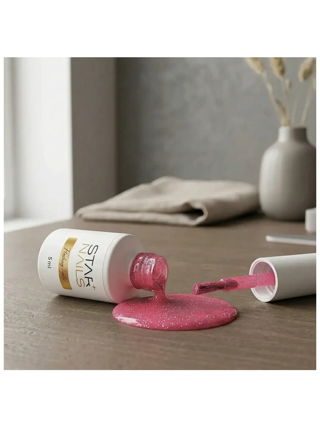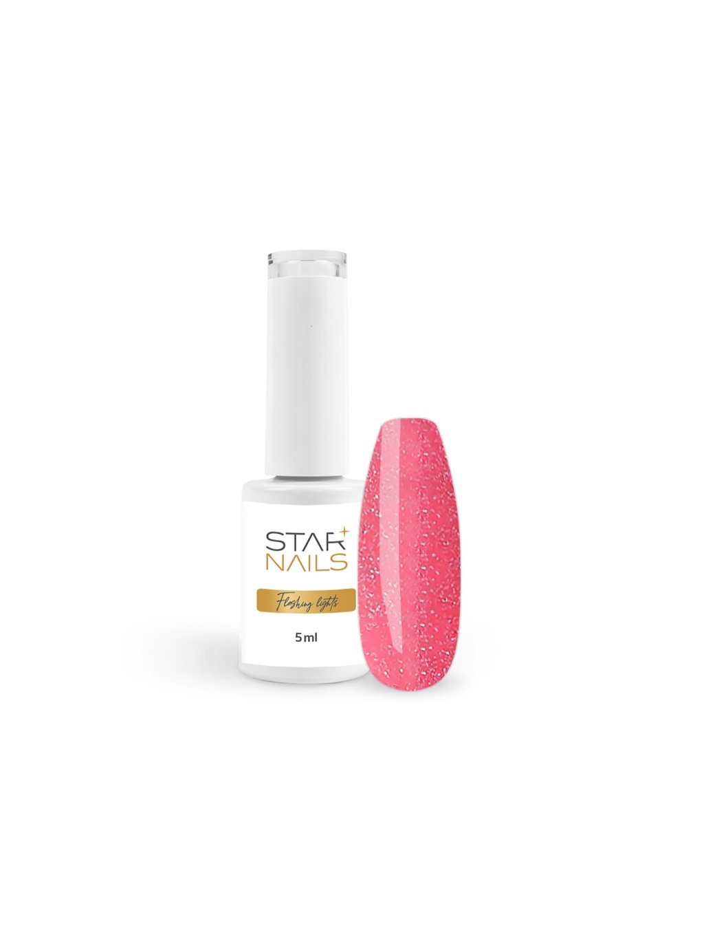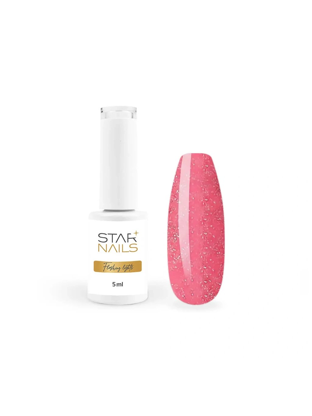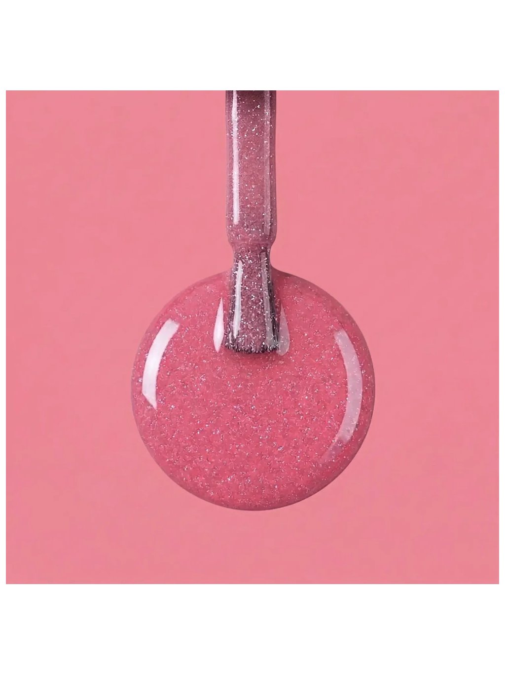 Efektový gél lak s trblietavými mikročasticami (flash glitter) v jasnom odtieni korálovo ružová s teplým sladkým nádychom. Vďaka špeciálnej technológii sa intenzita trblietania mení podľa dopadu svetla – v bežnom svetle pôsobí sviežo a hravo, vo „flash" momente sa rozžiari výrazným trblietaním.